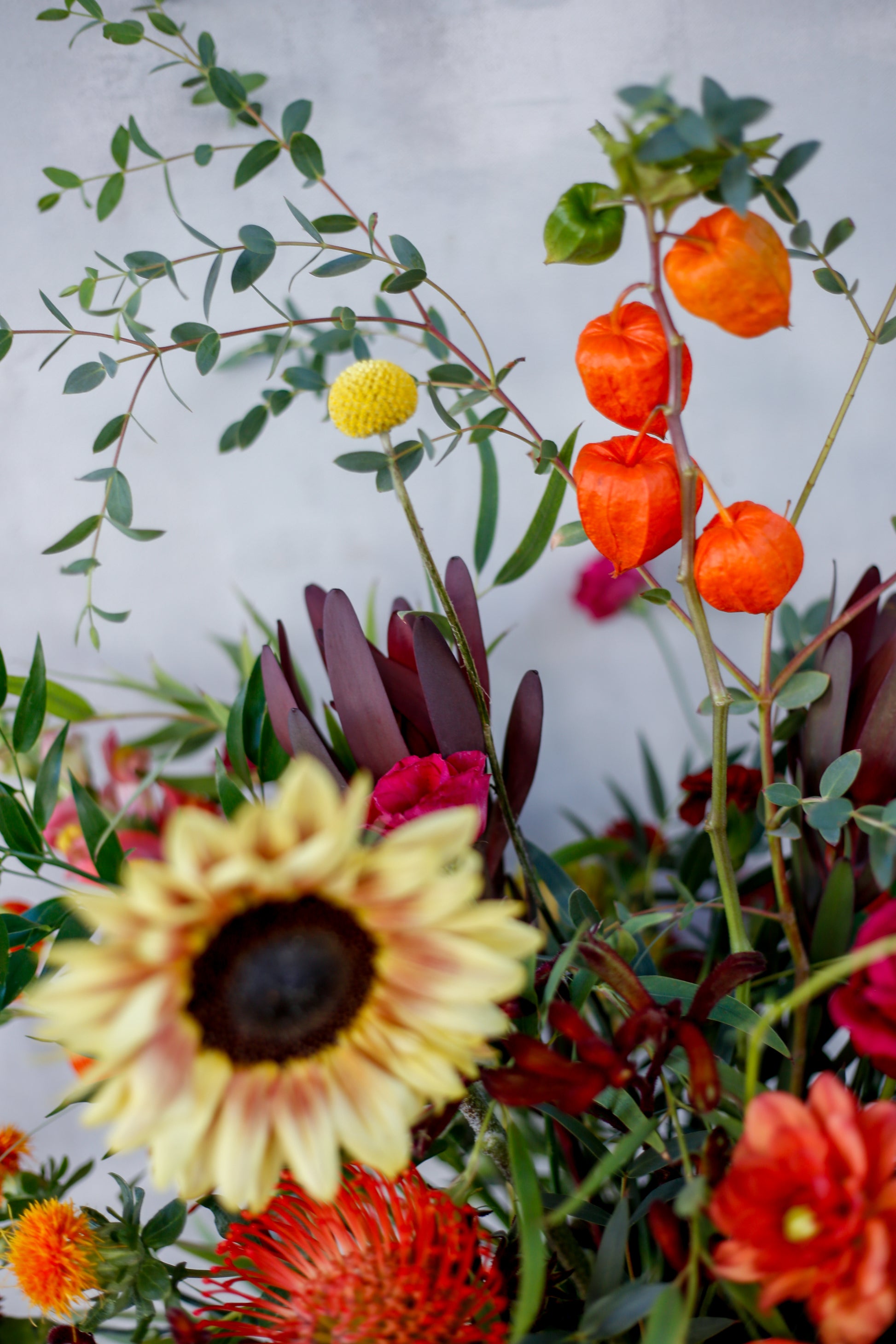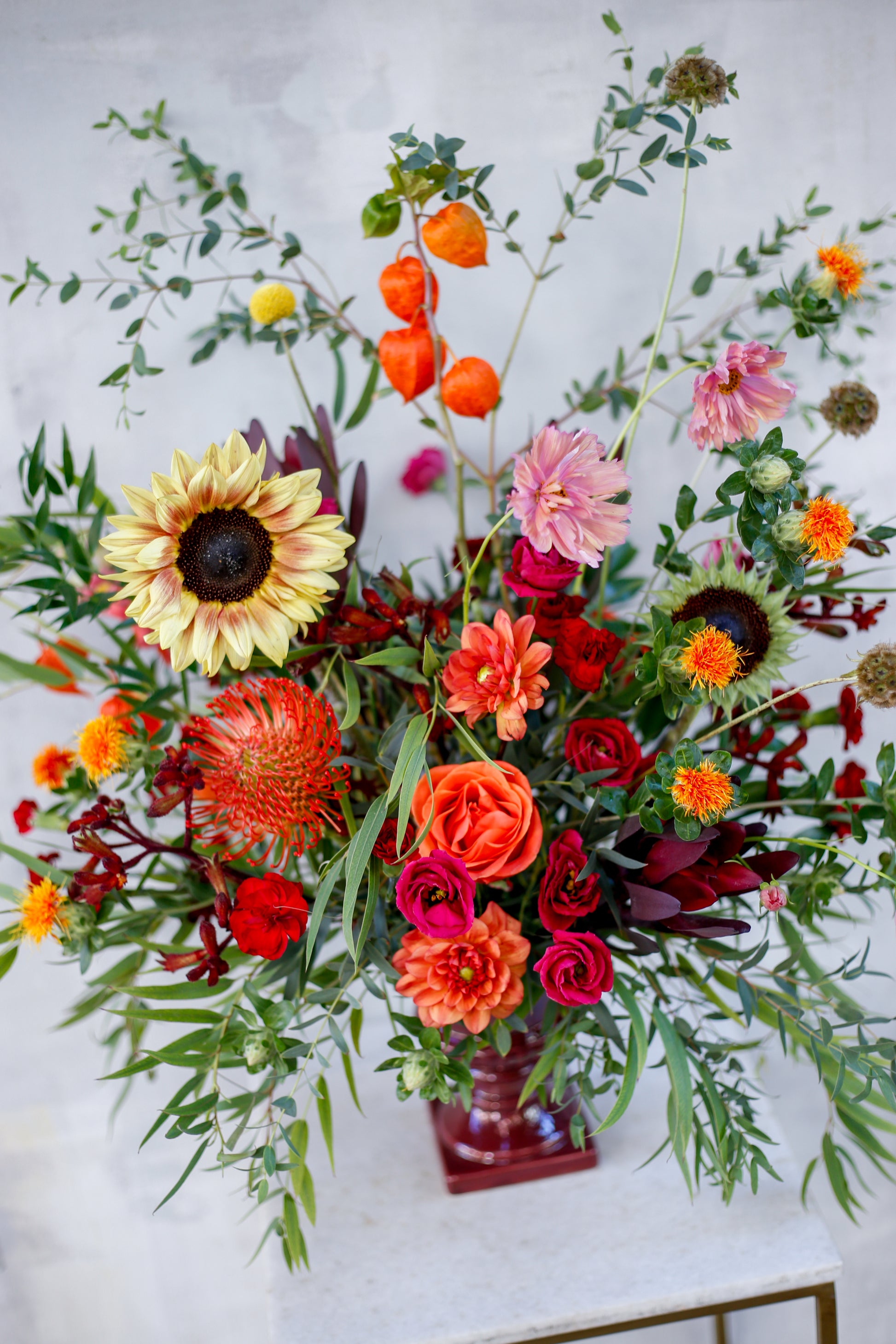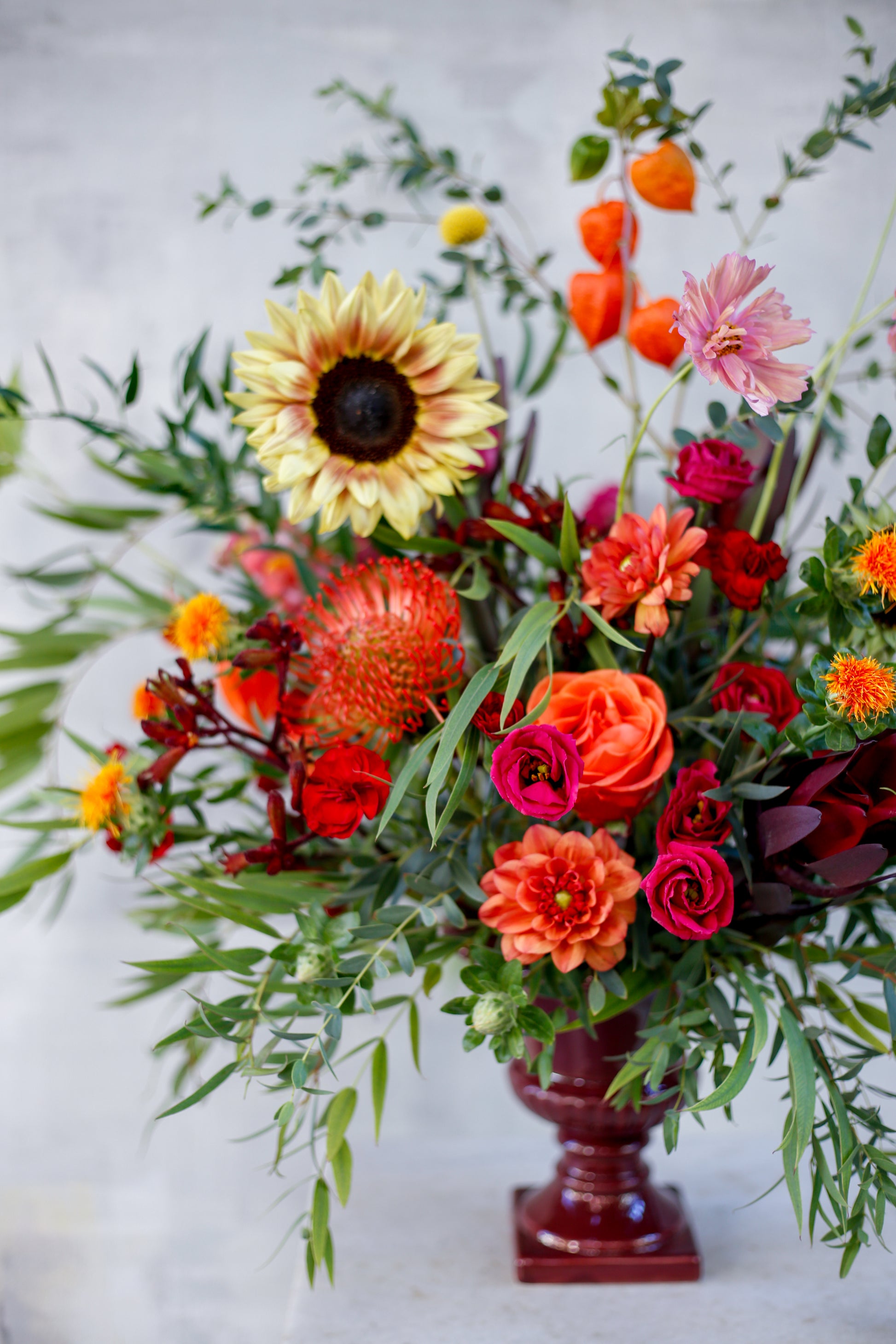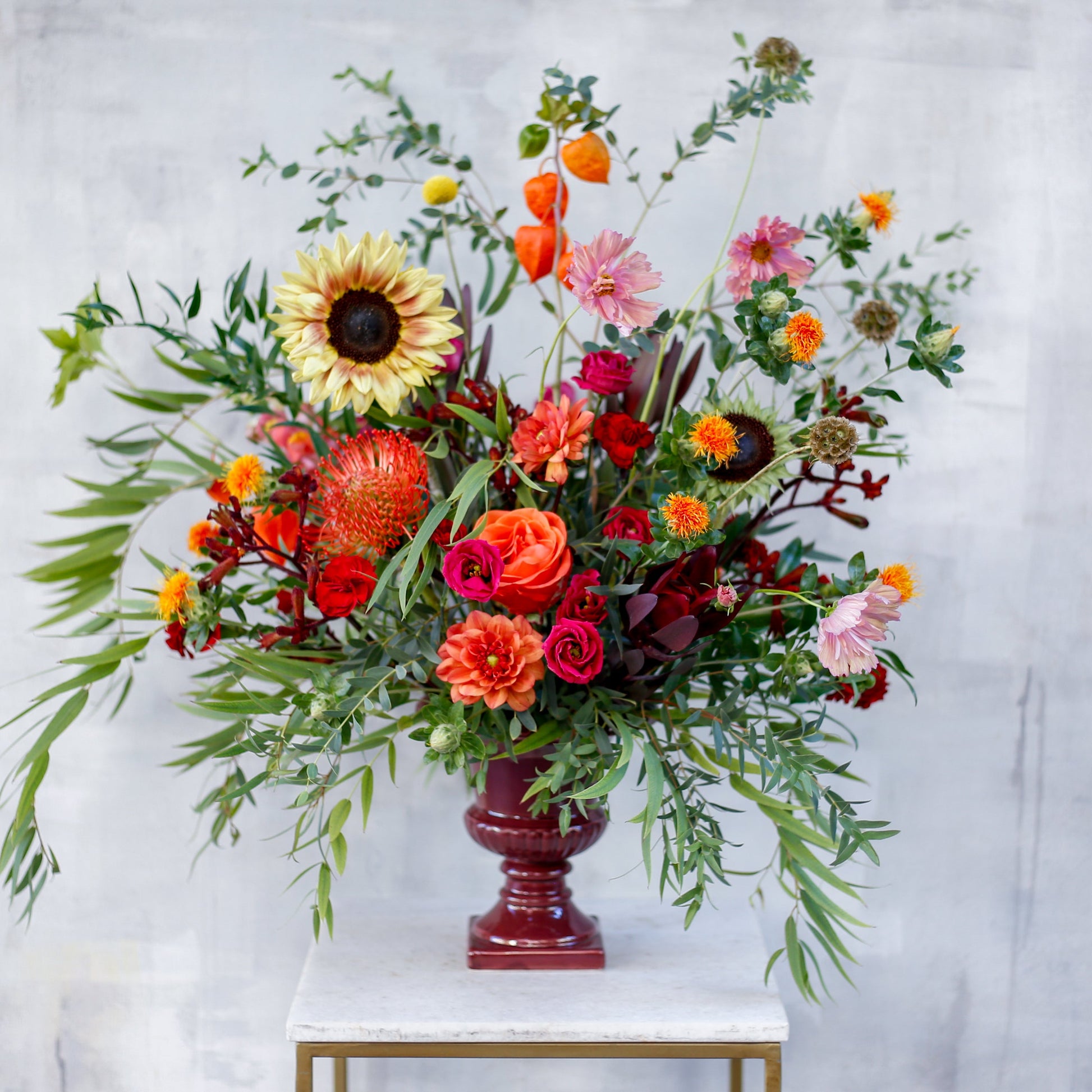 Arreglo de flores otoñal en copa de cerámica. Un regalo perfecto para sorprender en pedidas de mano, aniversarios, cumpleaños y locales o eventos. Está diseñado con una selección especial de flores frescas y verdes de temporada al estilo Brumalis.