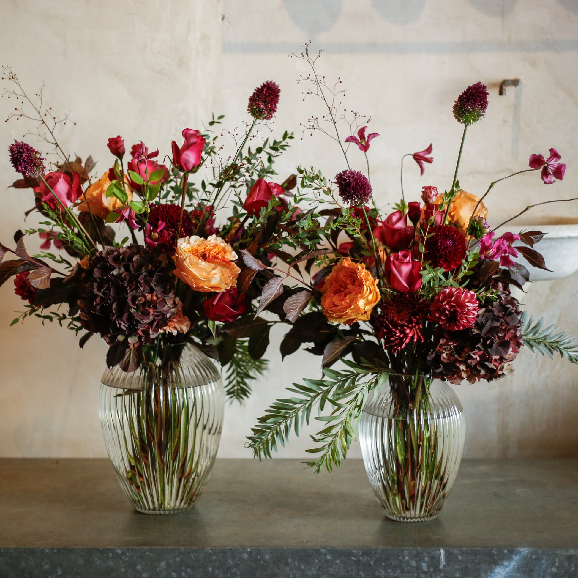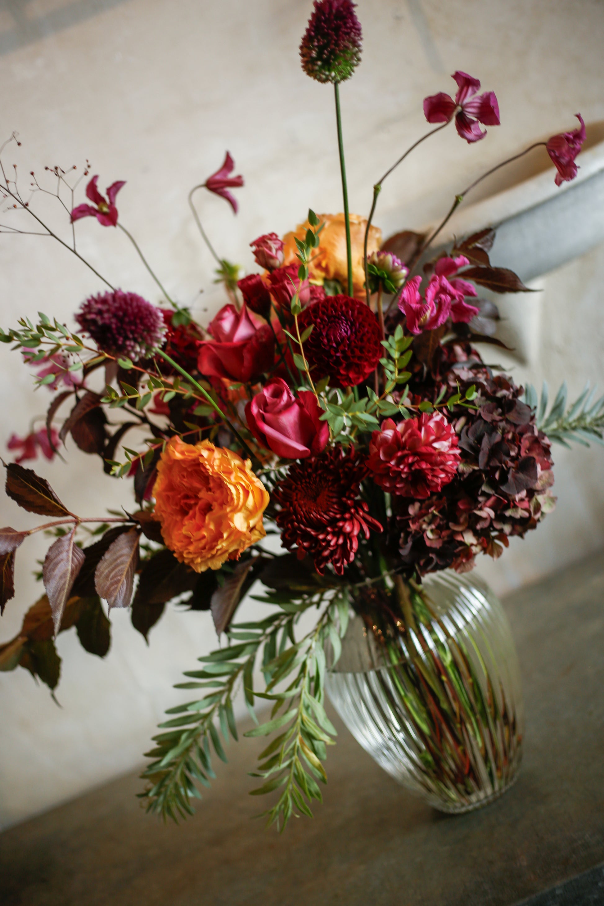 Flores de temporada otoñal, especial en tonos burdeos, naranjas y fucsias en jarrón acanalado. Un detalle perfecto para agradecer a lo grande o adornar cualquier rincón de la casa o evento.