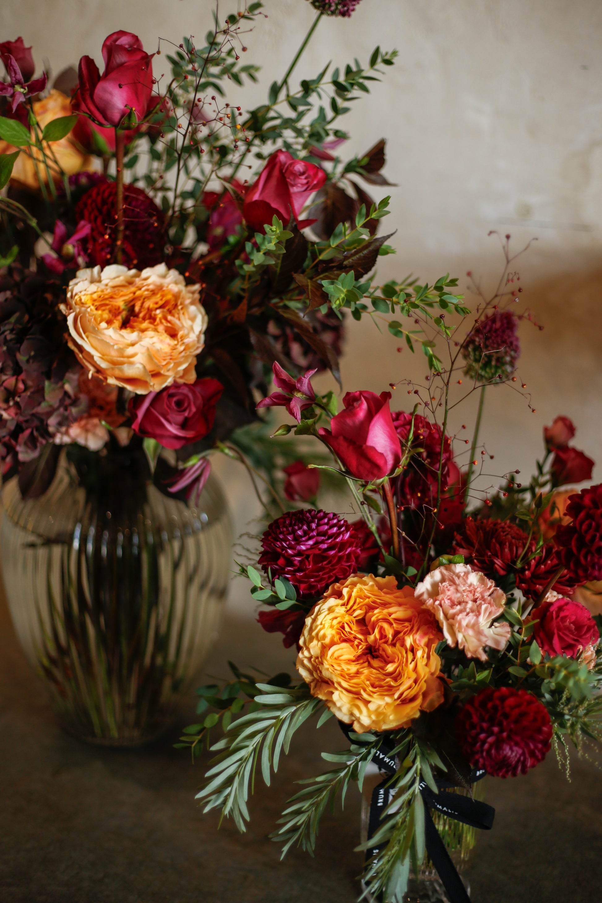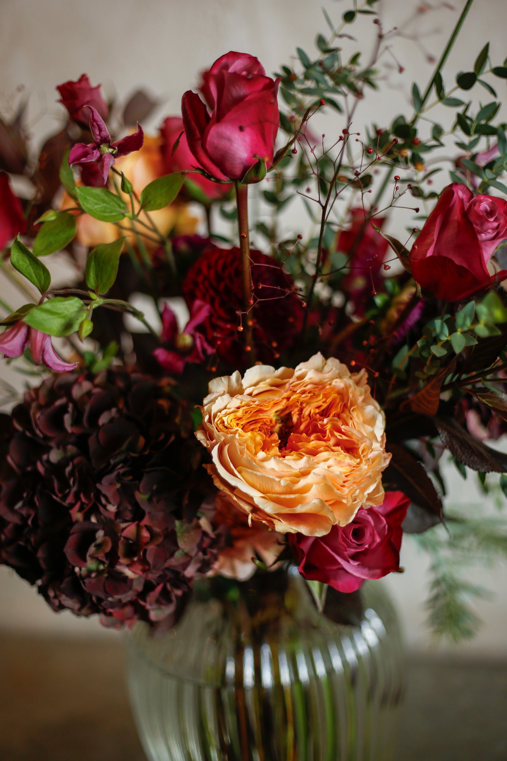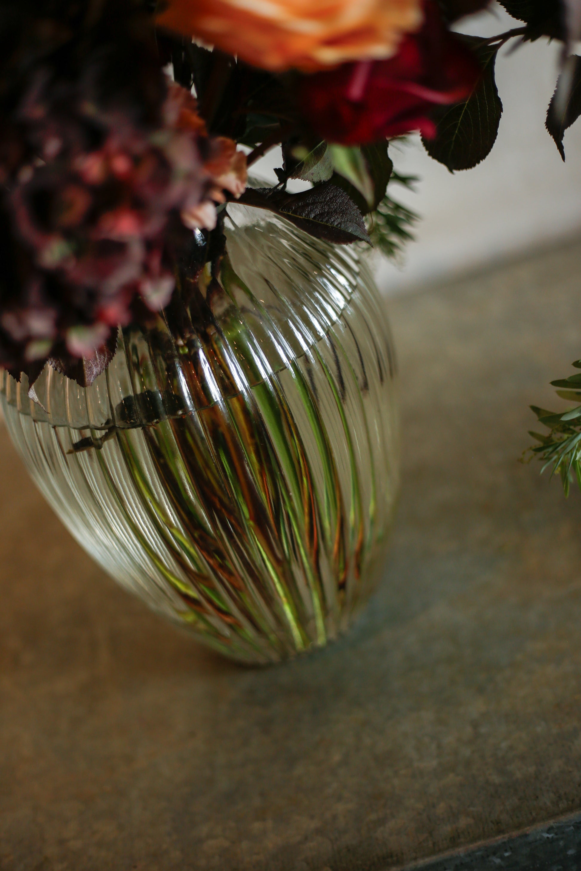 Flores otoñales burdeos en jarrón acanalado