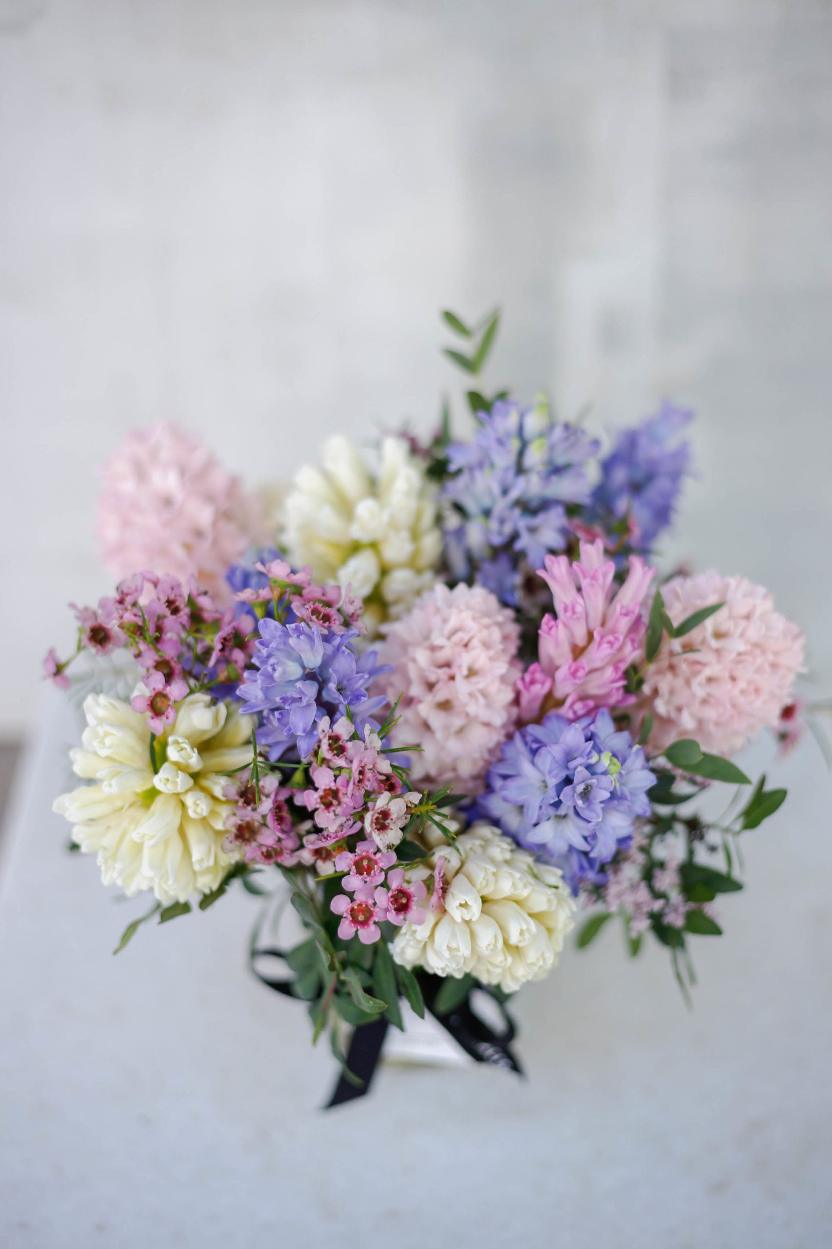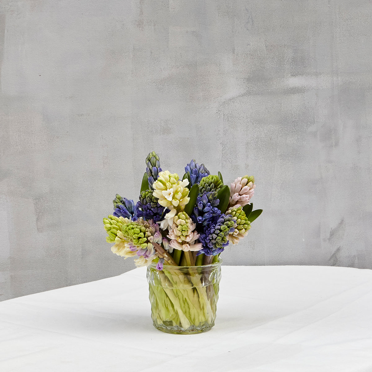 Docena de jacintos en jarrón* de vidrio. Este bulbo de temporada huele de maravilla y es un pequeño detalle ideal para perfumar una habitación, oficina o cualquier otro espacio de la casa. El modelo del jarrón puede variar.