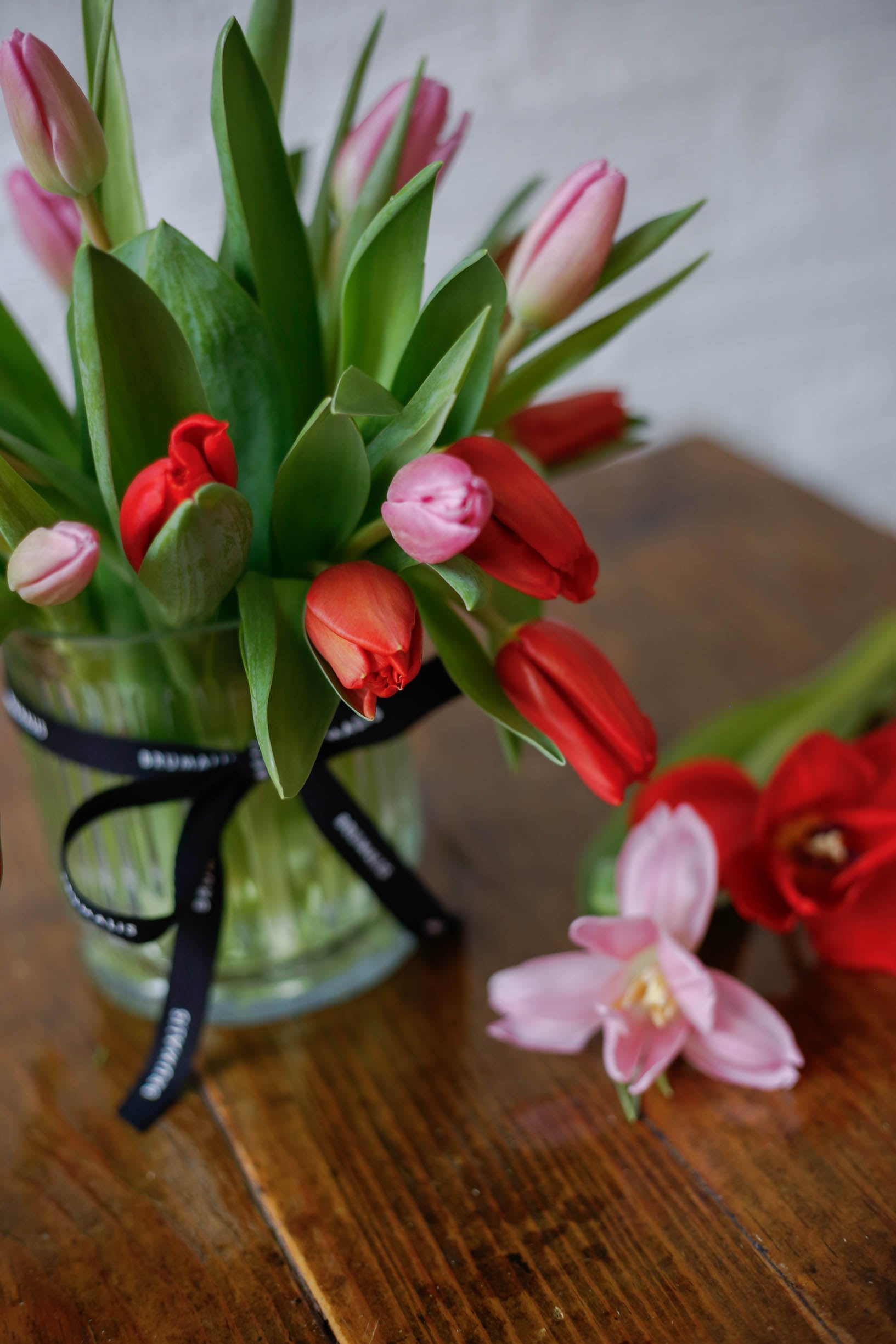 Para San Valentín regala un ramo de mix de tulipanes en jarrón de vidrio estriado. Los tulipanes son una de las flores más especiales del invierno, crecen en agua y se mueven en busca de la luz logrando formas orgánicas únicas.