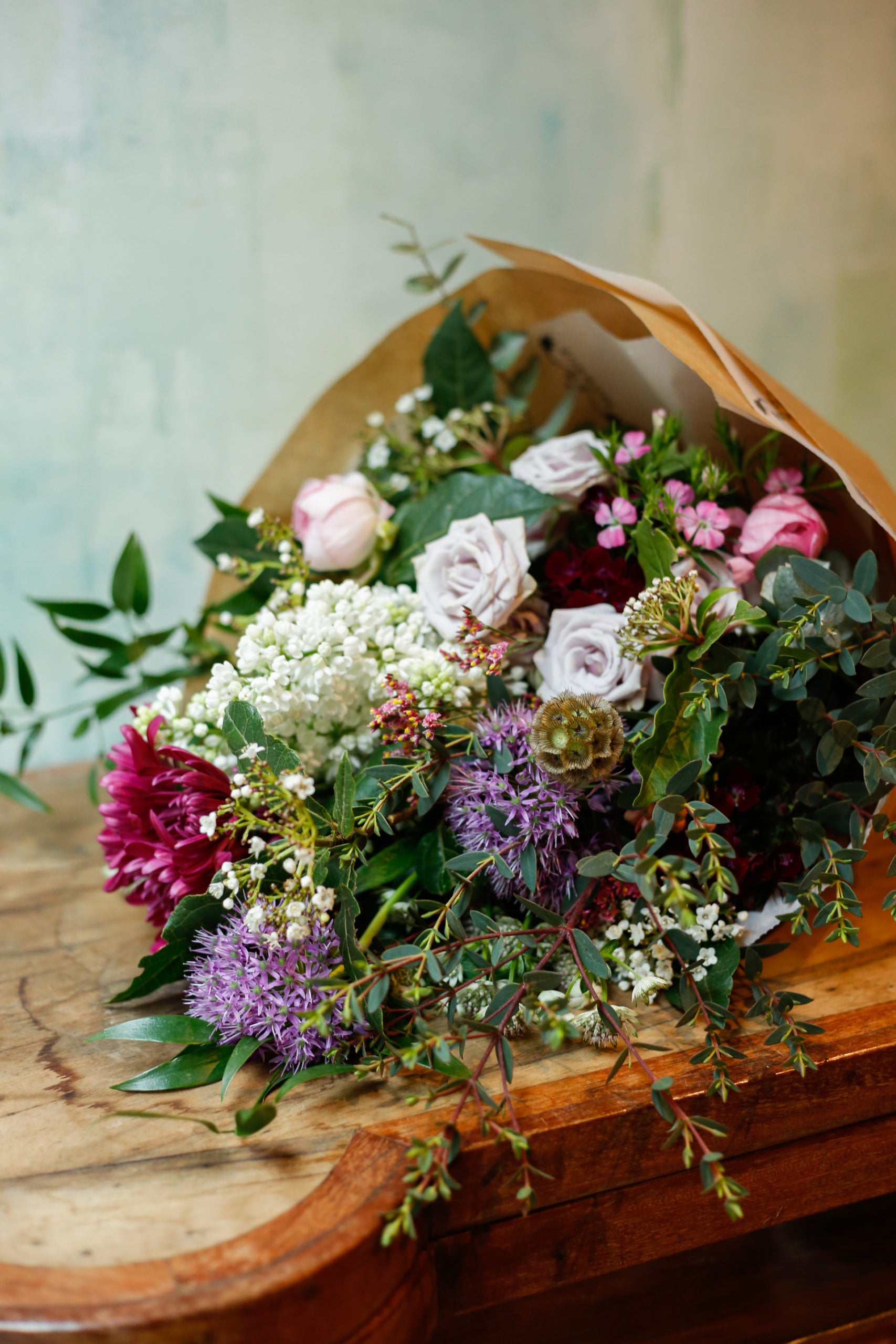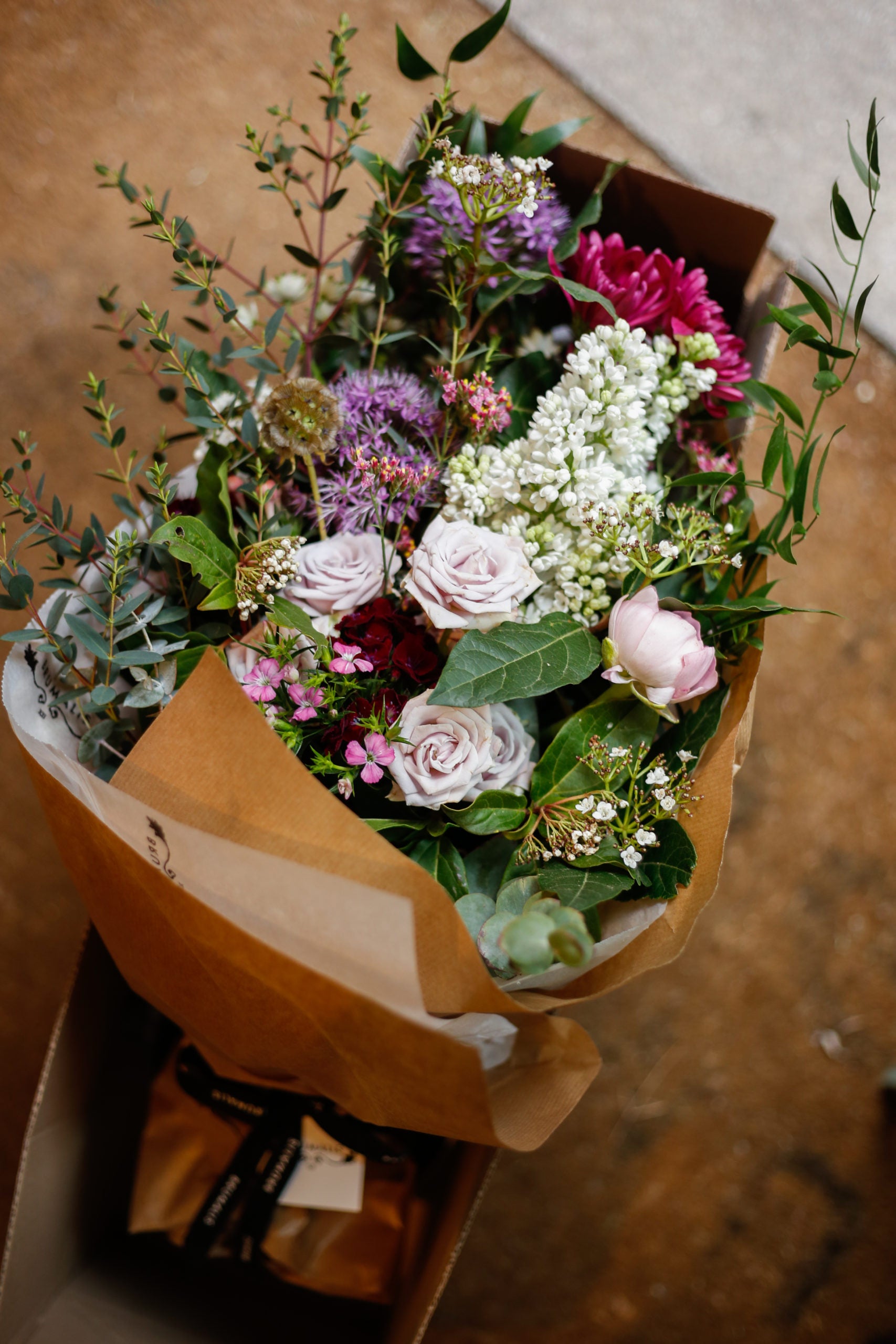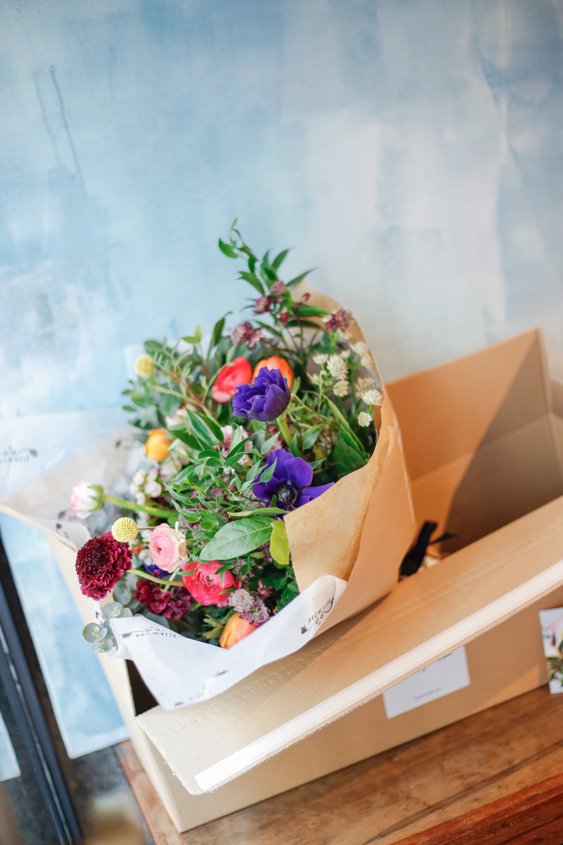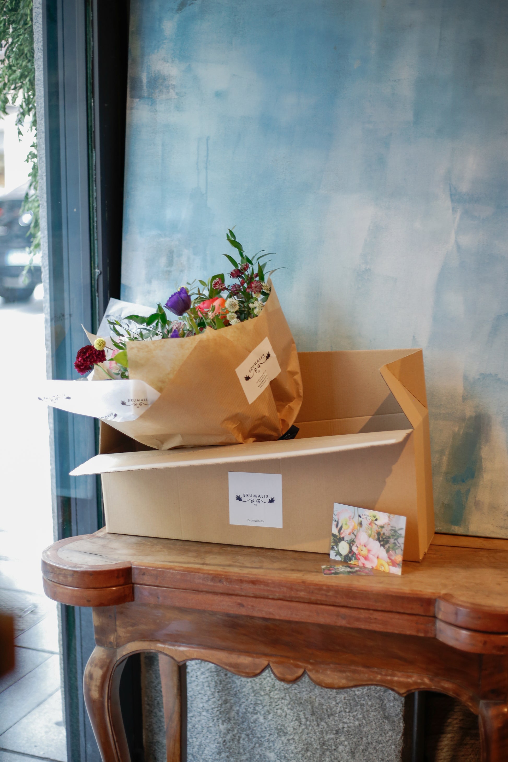 Nuestro ramo de flores de temporada especialmente seleccionadas, envuelto en papel de seda y con el característico estilo Brumalis. El ramo se enviará en una caja especialmente diseñada para el envío de flores.