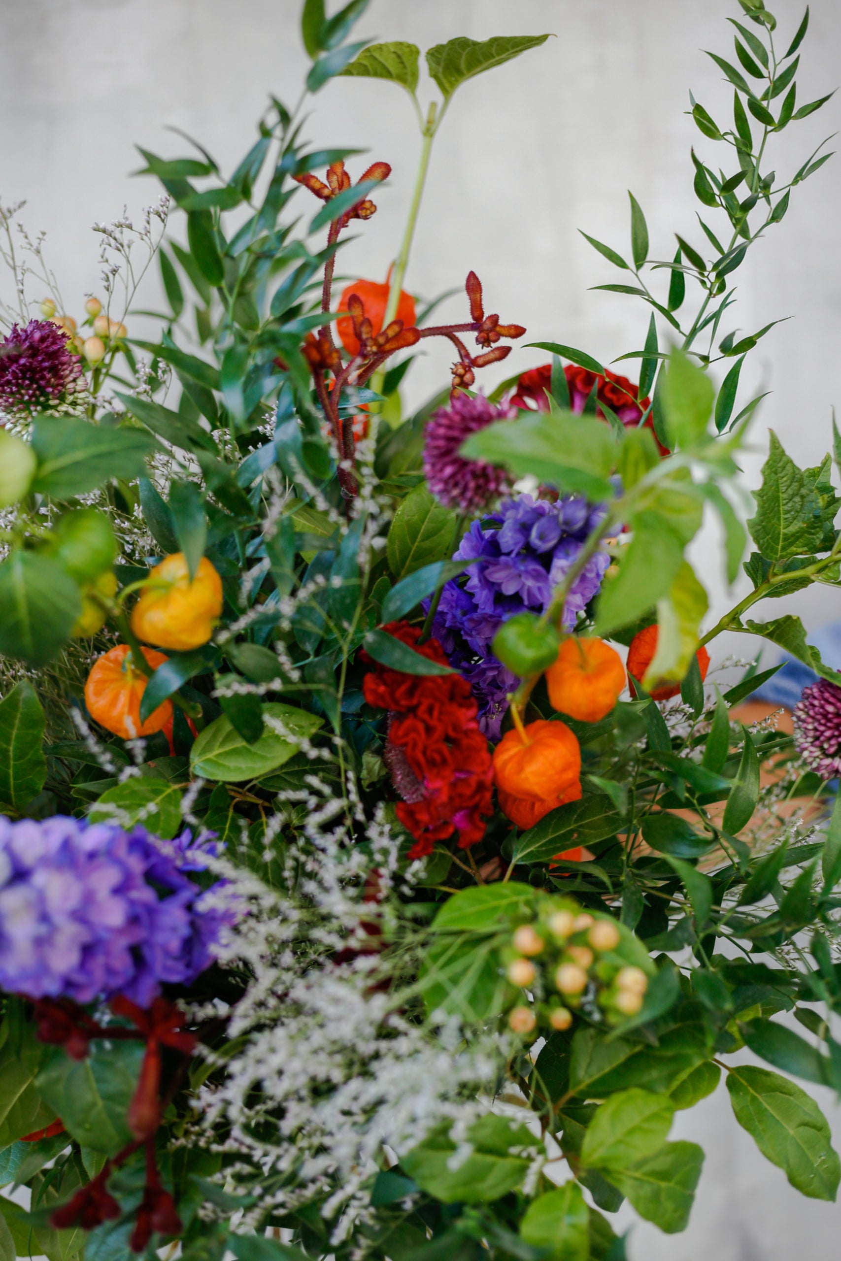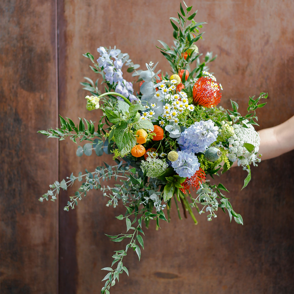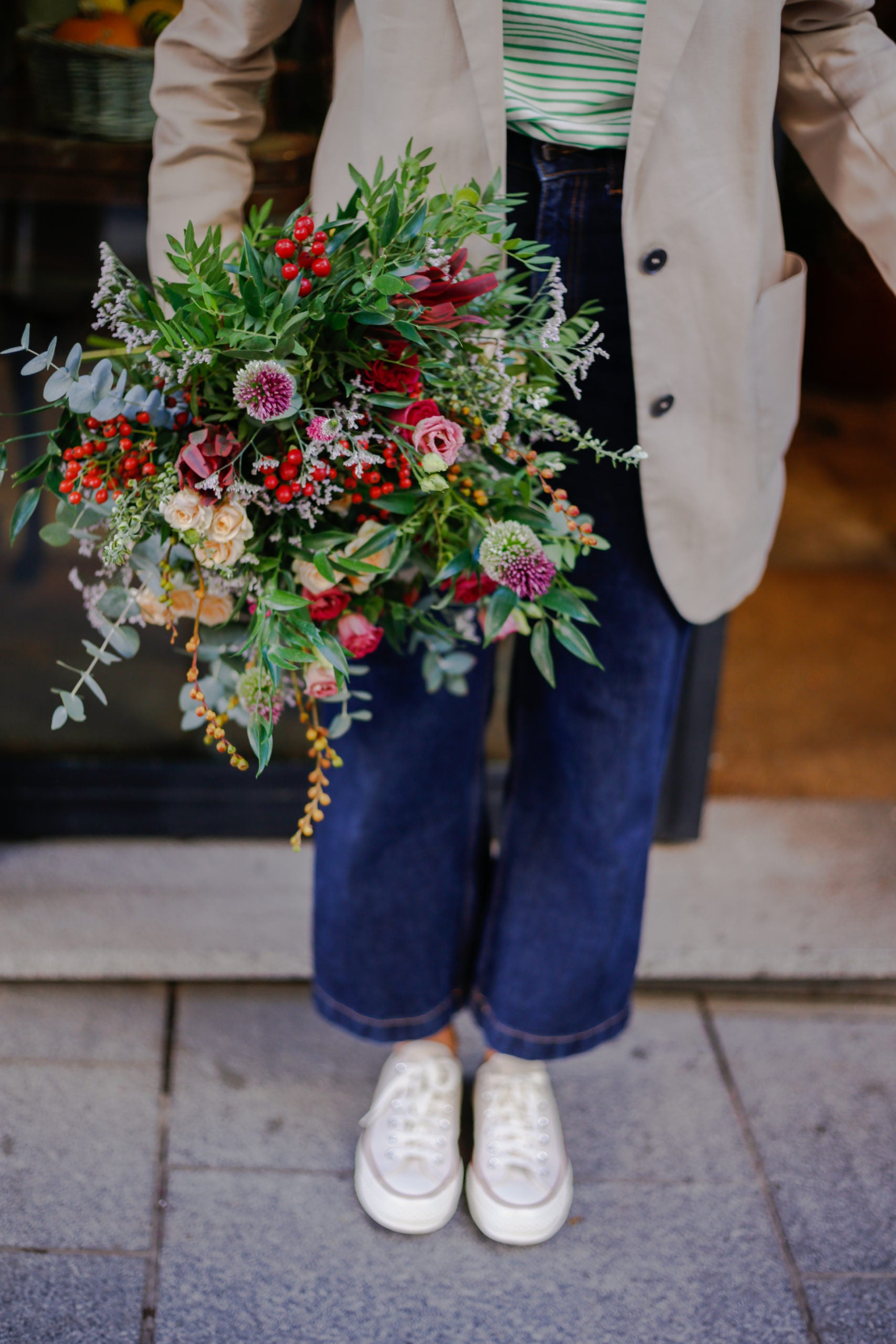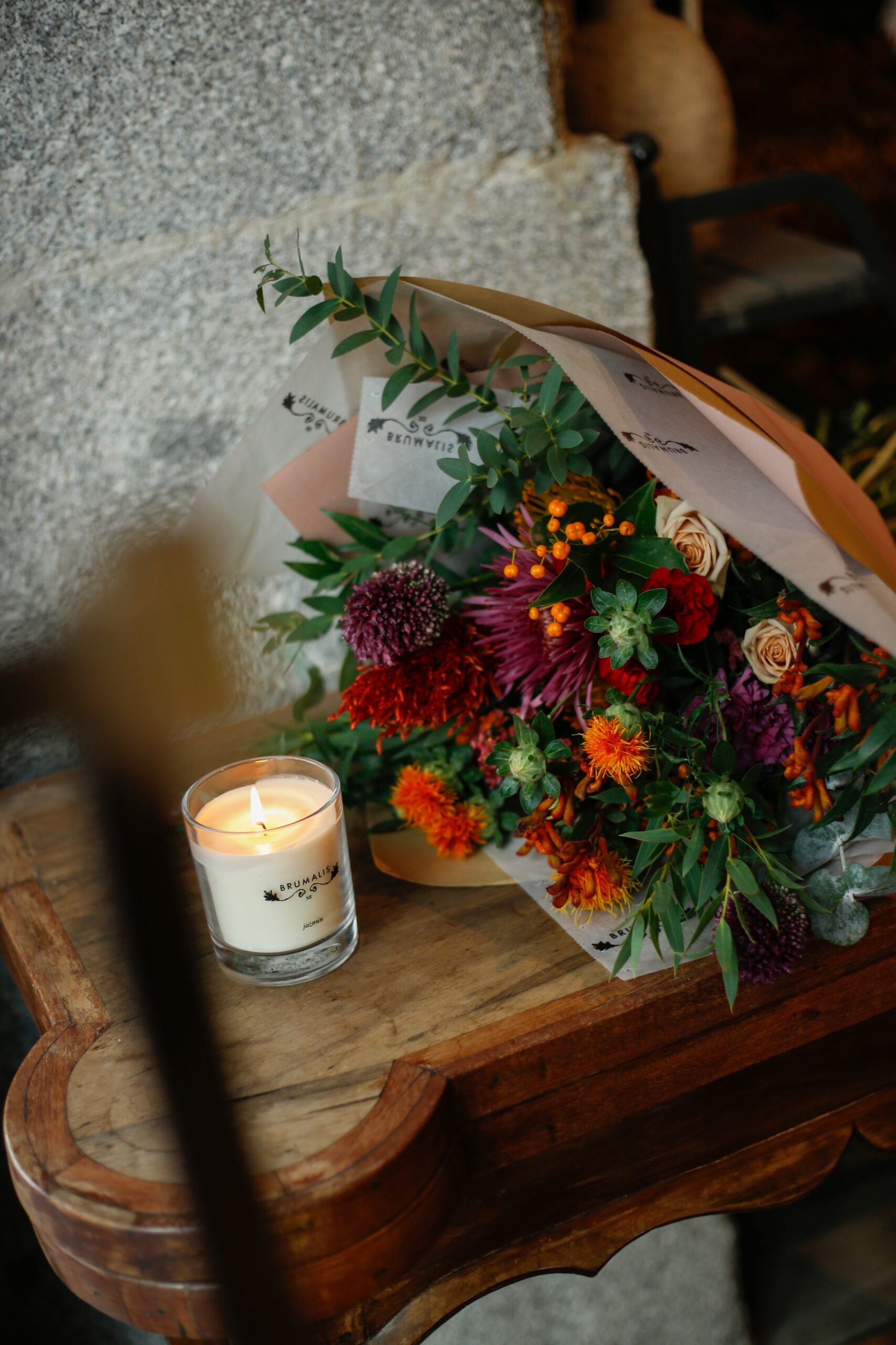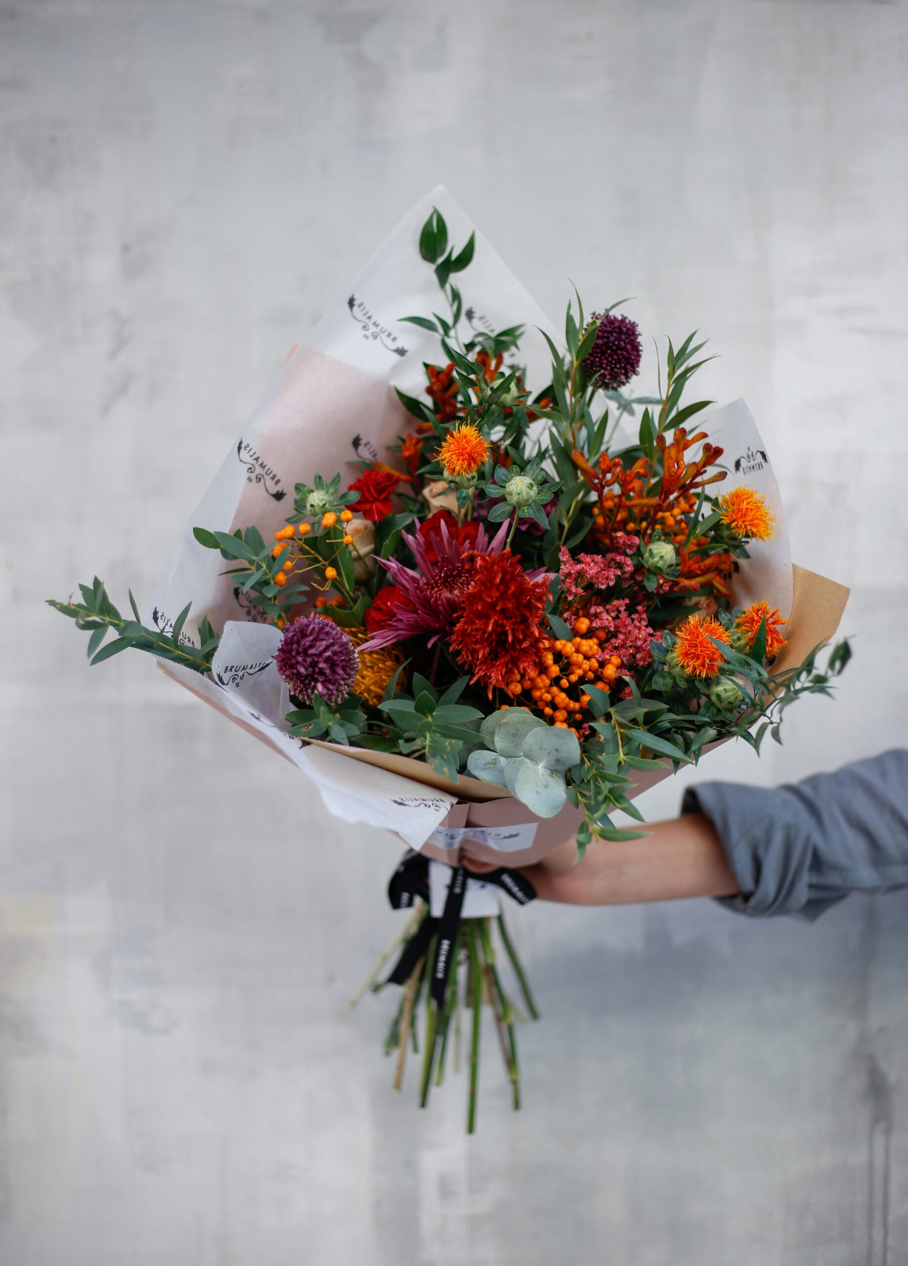 Ramo de flores otoñal de temporada, envuelto en papel de seda. Un ramo de flores muy especial, diseñado con flores en tonos otoñales cálidos e intensos. Mezclado con una selección de verdes aromáticos y agrestes. El ramo se enviará en una caja especialmente diseñada para el envío de flores.