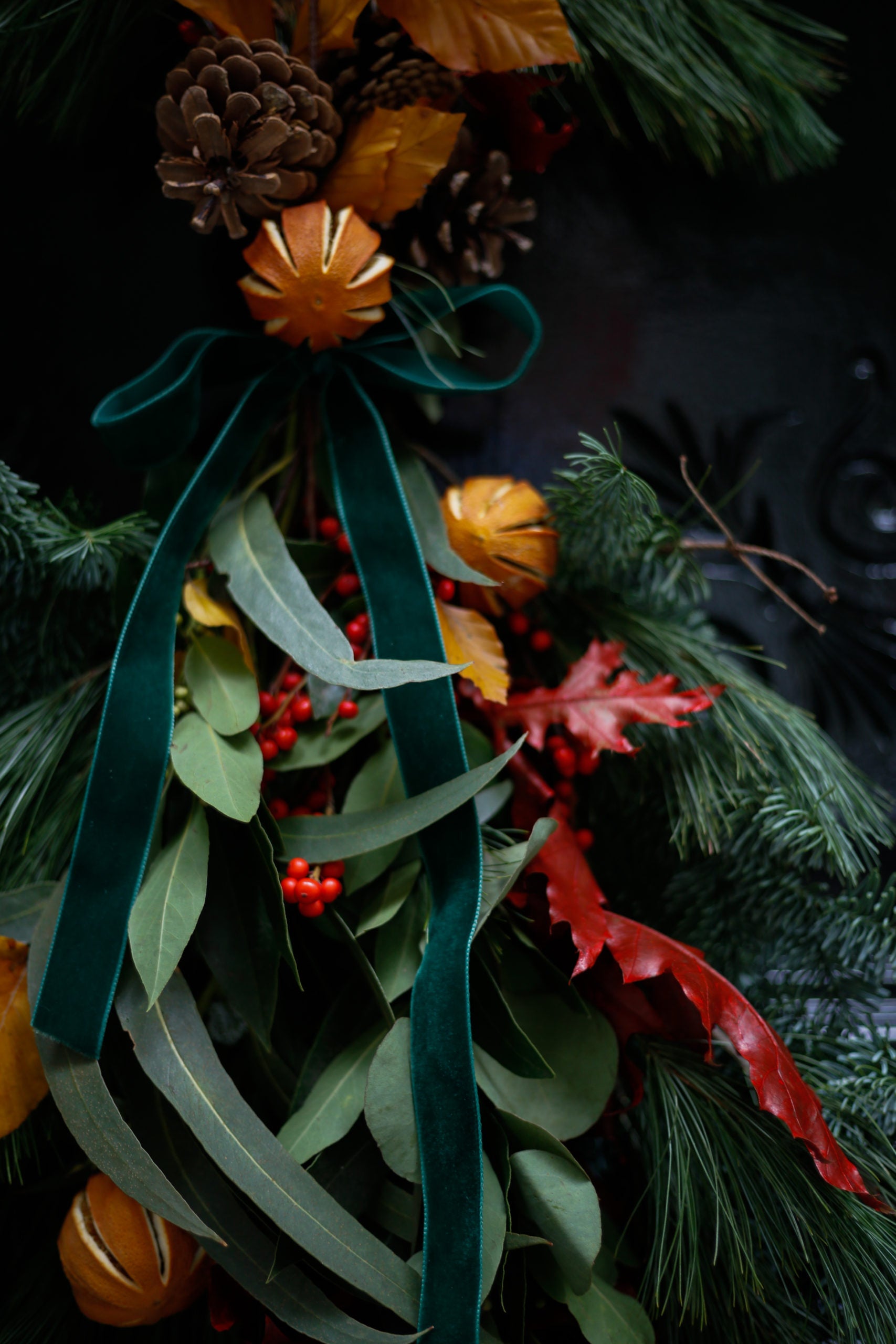 Ramo de Navidad especialmente pensado para colgar en la puerta o en la pared, colocarlo sobre la chimenea o como alternativa al tradicional árbol de Navidad. Realizado con pinsapo, haya y roble preservado, piñas, naranjas, illex, eucalipto y más verdes de temporada.