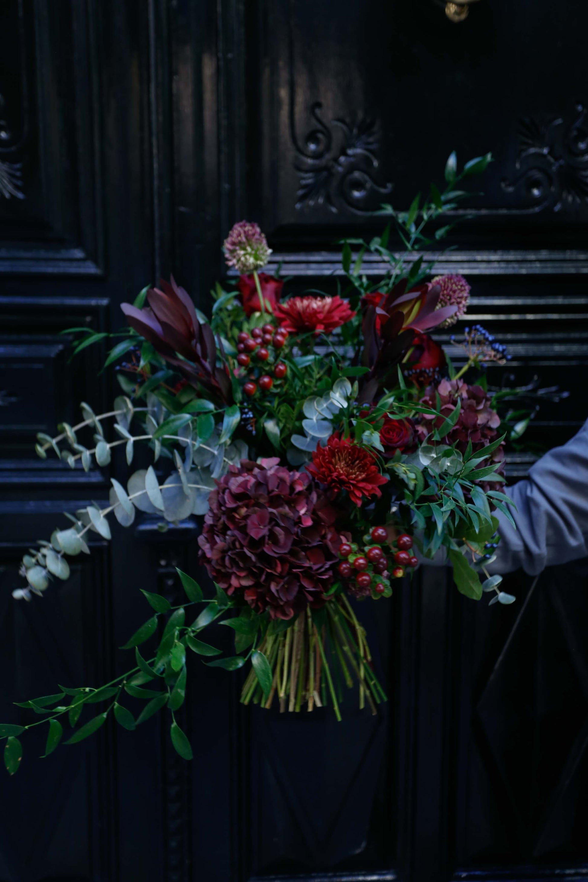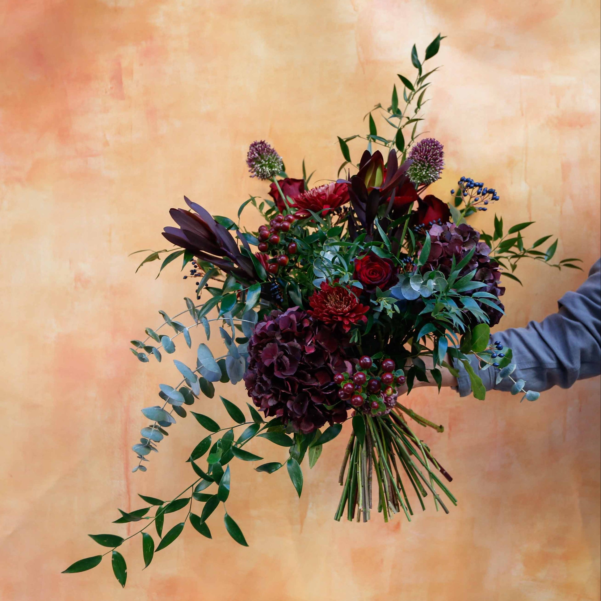 Ramo de flores de temporada confeccionado especialmente con flores en tonalidades burdeos, rojos y similares.
